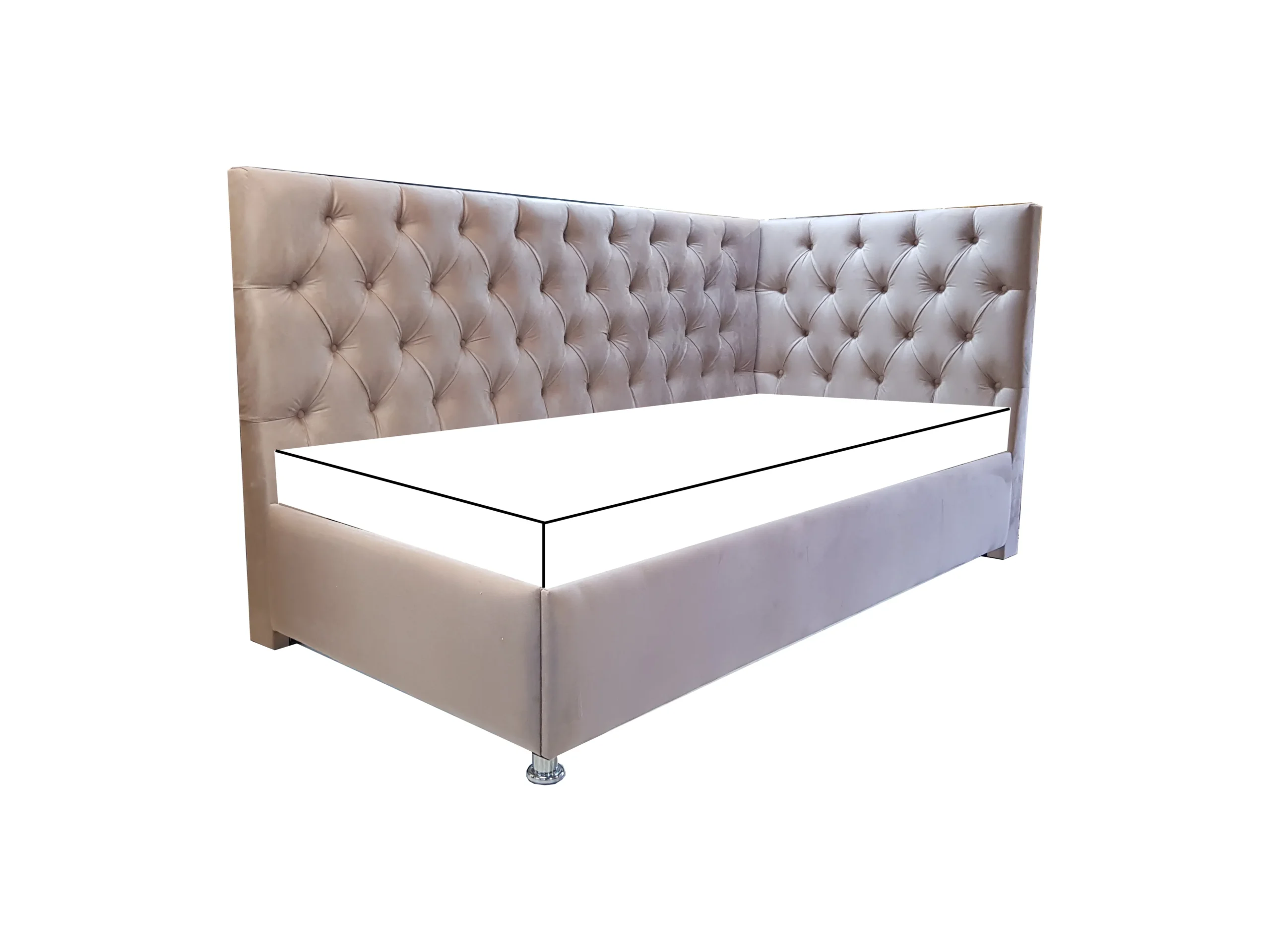 В наличии Кровать Версаль Угловая, 90×200, Металлическое с ламелями, Велюр Бани бежевый, Ножки 5 см стандарт, Угол Левый — длинное изголовье слева.