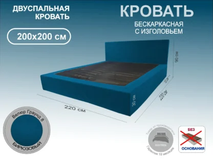 Кровать Бескаркасная, 200×200, бескаркасное, Велюр Граунд 8-бирюзовый, Ножки Без ножек Чехол на царгах НЕ съемный, Упаковка в картон,.