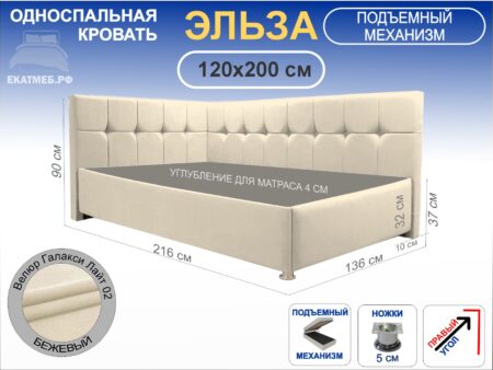 Кровать Эльза, 120×200, Подъемный механизм полное дно с полкой, Велюр Галакси лайт 02-бежевый, Ножки 5 см стандарт, Угол Правый — длинное изголовье справа Чехол на царгах НЕ съемный,.