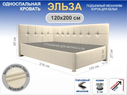В наличии Кровать Эльза, 120×200, Подъемный механизм полное дно с полкой, Велюр Галакси лайт 02-бежевый, Ножки 5 см стандарт, Угол Правый — длинное изголовье справа Чехол на царгах НЕ съемный,.