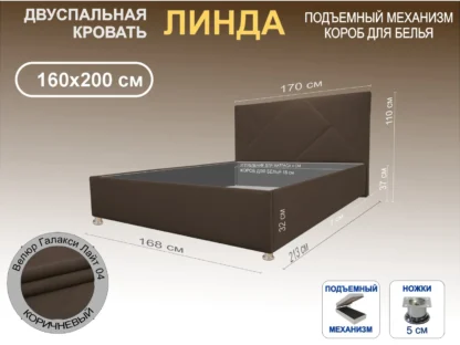 В наличии Кровать Линда, 160×200, Подъемный механизм полное дно с полкой, Велюр Галакси лайт 04-коричневый , Ножки 5 см стандарт.