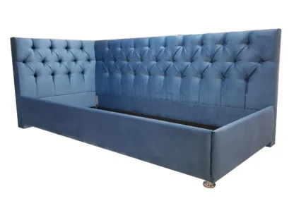В наличии Кровать Версаль Угловая, 90×200, Металлическое с ламелями, Велюр Велютто 47-синий, Ножки 5 см стандарт, Угол Правый — длинное изголовье справа Чехол на царгах НЕ съемный, Высота изголовья 90 см.