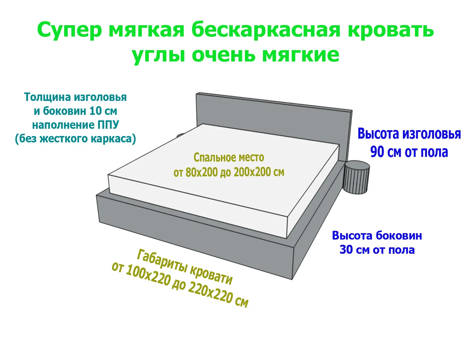 Боковинки и изголовье бескаркасной кровати выполнены из мягкого плотного материала ППУ, который сохраняет форму даже после длительного использования.