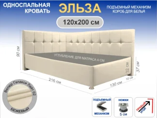 Кровать Эльза, 120×200, с подъемным механизмом полное дно с полкой, Велюр Галакси лайт 02-бежевый, Ножки 5 см стандарт, Угол Правый — длинное изголовье справа Чехол на царгах НЕ съемный